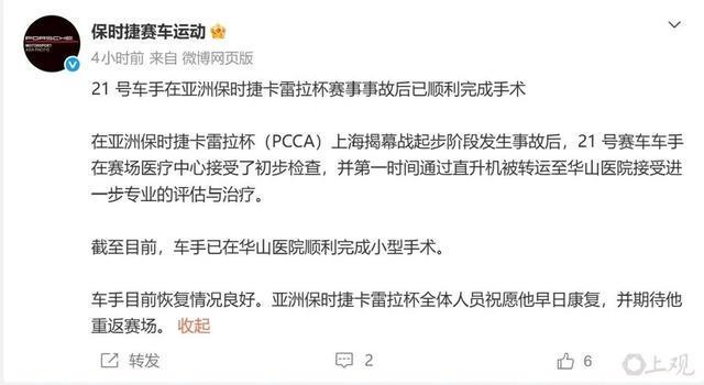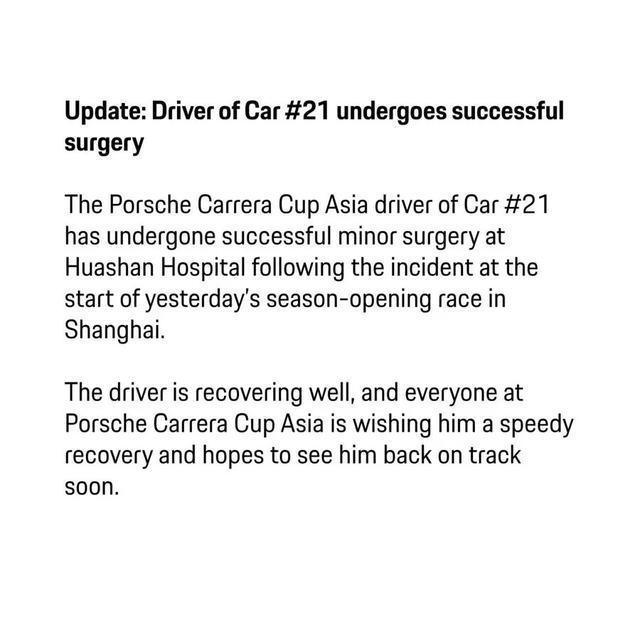 据中国首位F1赛季全勤报道者钱俊透露:3月15日,亚洲保时捷卡雷拉杯房车赛组委会发布通告,标题为 “最新消息:21号车车手手术成功”。通告表示,“在昨日上海揭幕战发车阶段发生事故后,保时捷卡雷拉杯亚洲组21号车车手已在华山医院成功接受小型手术。目前车手恢复情况良好,保时捷卡雷拉杯亚洲组全体人员祝愿他早日康复,期待他重返赛场。”